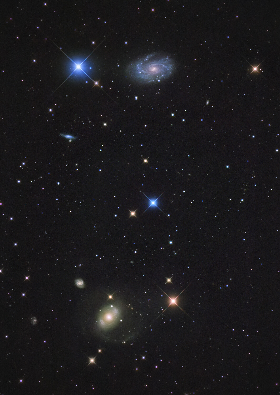 隣り合った青い恒星と青っぽい銀河、黄色の恒星とシンクロしたような色合いの銀河の織り成すハーモニーが何とも言えません。